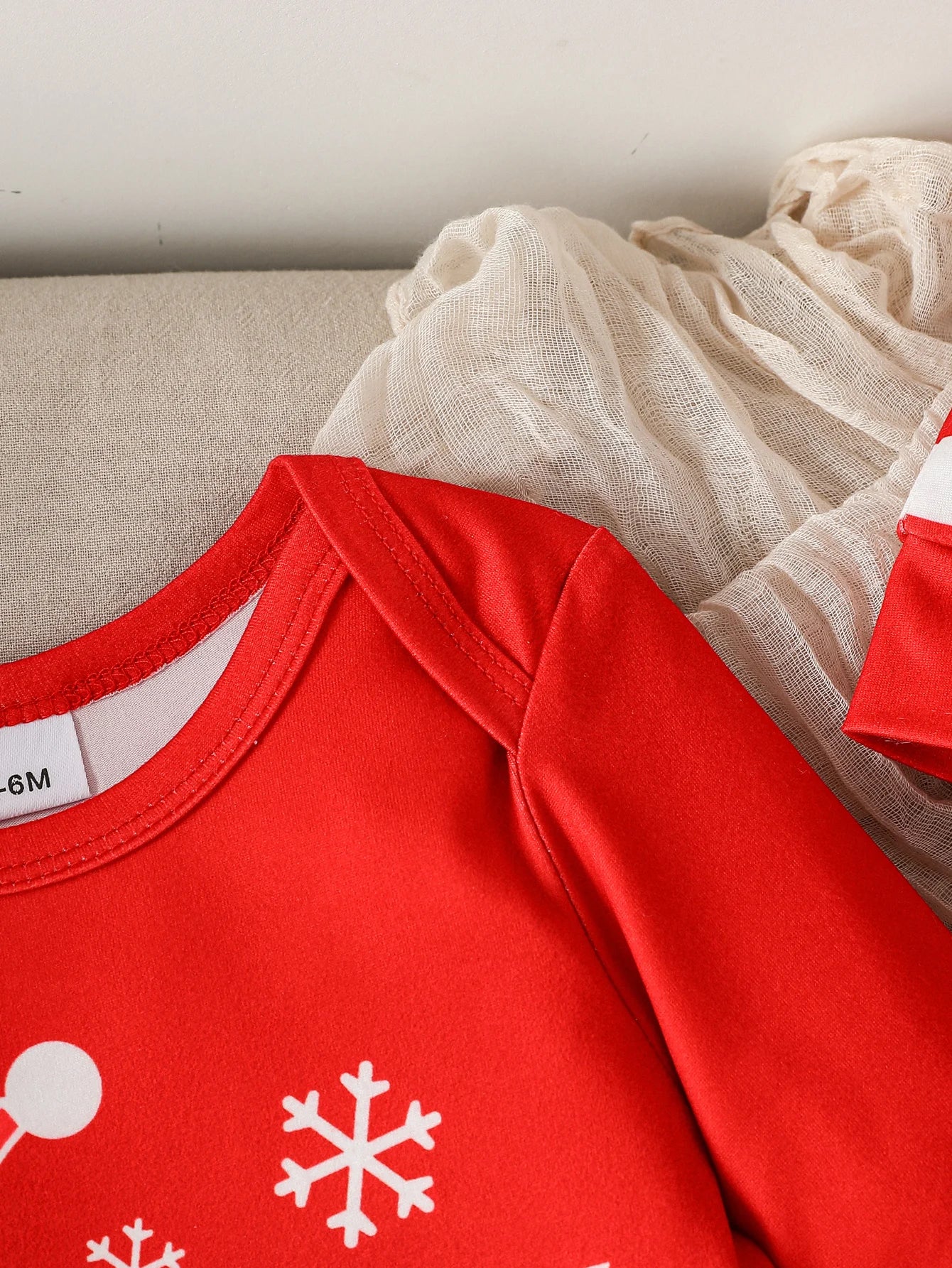 Celebrate your baby’s first Christmas in the sweetest way with this festive three-piece outfit! The soft red bodysuit features a cheerful Santa print and “My First Christmas” lettering, paired with striped pants and a matching hat for the perfect holiday look. Made from cozy, breathable cotton blend, it’s ideal for family gatherings, photoshoots, and all your baby’s Christmas memories.