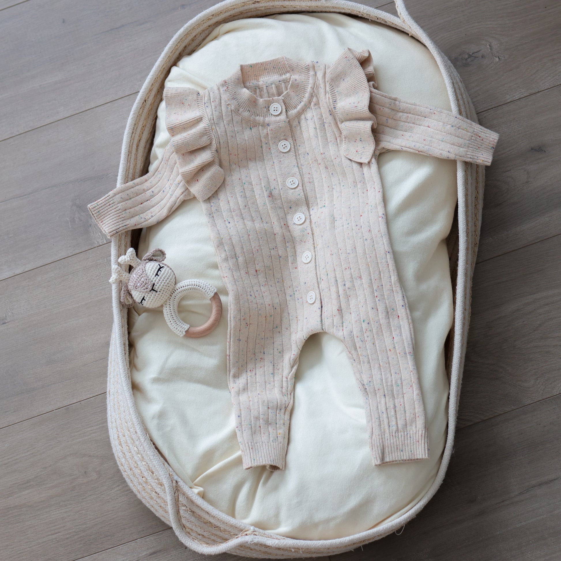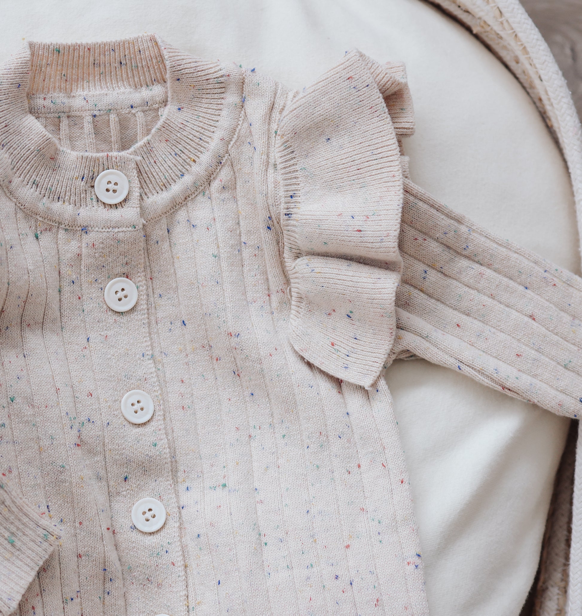 Ribbed Flutter Sleeve Knit Jumpsuit made from a speckled beige yarn. Ultra soft and cozy!