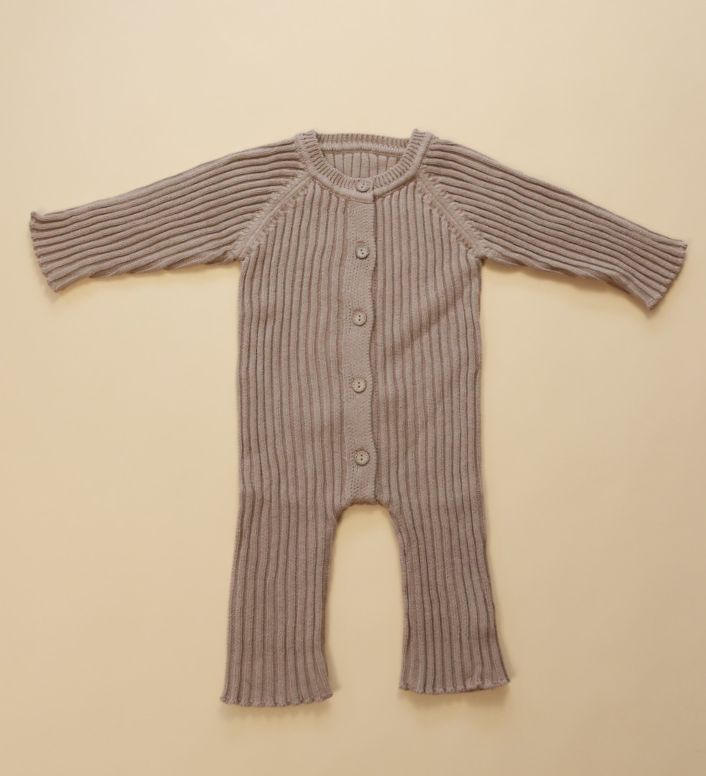 Ribbed Knit Button Up Romper in Beige